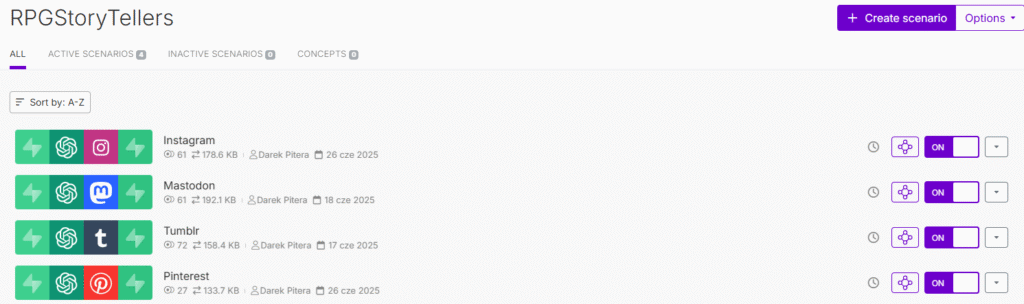 I tu dochodzimy do sedna. Zamiast jednego scenariusza, który publikuje wszędzie, mam kilka małych i niezależnych w Make.com. Osobny dla LinkedIn, osobny dla X i tak dalej.