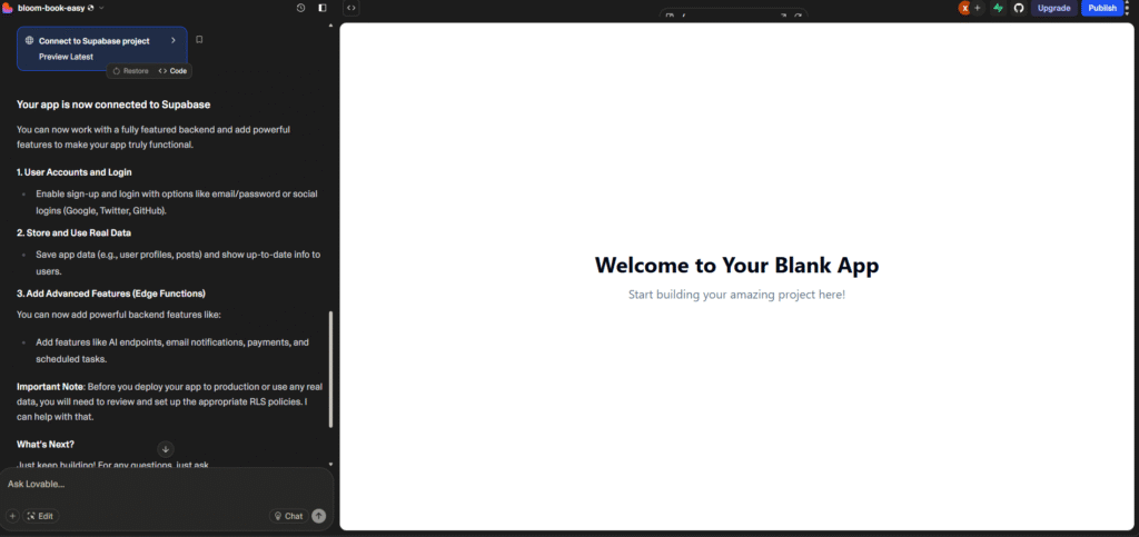 UWAGA: Zauważcie, że celowo prosiłem o to aby dodał tabele bazy danych wraz z polami. W naszym teście będziemy łączyli Lovable z Supabase. Bez tego mówienie o prawdziwej aplikacji – to tak jak mówienie o tym, że Fiat 500 to w praktyce Ferrari.