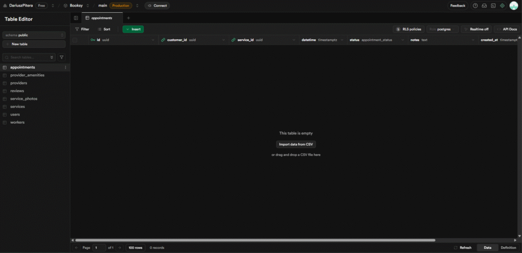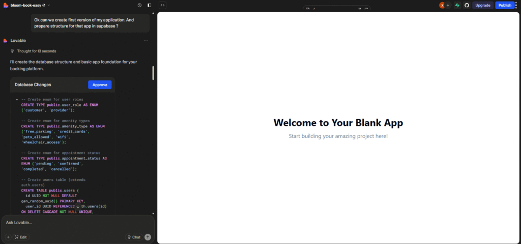 Najpierw prosimy Lovable o stworzenie struktury Bazy danych. Nie wiem czy domyślnie zrobiłby to sam – ja poprosiłem go wprost: “Ok can we create first version of my application. And prepare structure for that app in supabase ?“