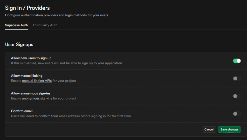 Na potrzeby testów w Supabase – wyłączmy konieczność potwierdzania adresu e-mail: