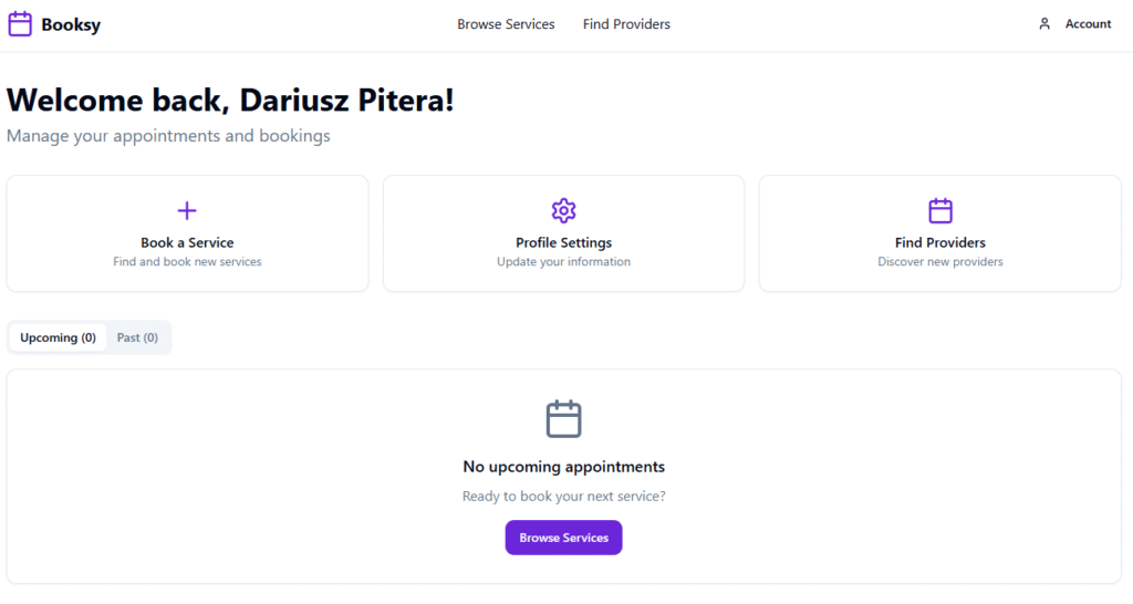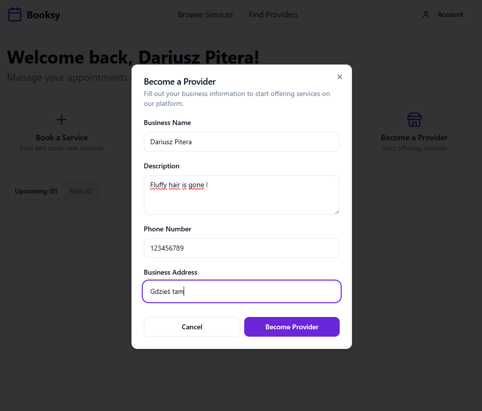 Po ustawieniu tego parametru – udało nam się zalogować. Aplikacja prawie gotowa – ale nie mamy miejsca gdzie Usługodawcy mogli by dodawać swoje usługi.