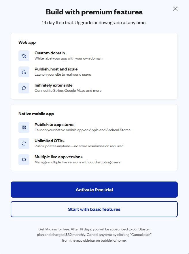 W bubble bardzo fajne jest to, że płatny plan jest nam w zasadzie potrzebny dopiero przy uruchamianiu aplikacji. Do tego momentu – możemy tworzyć za darmo – w przeciwieństwie do Lovable.
