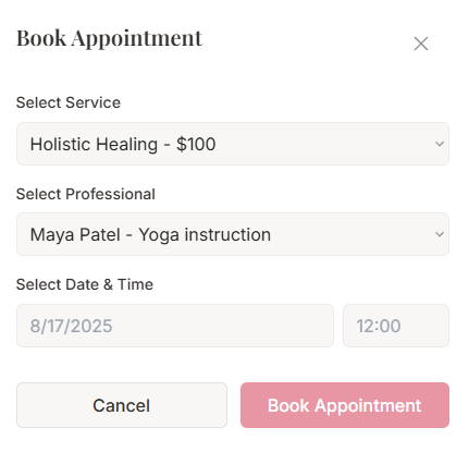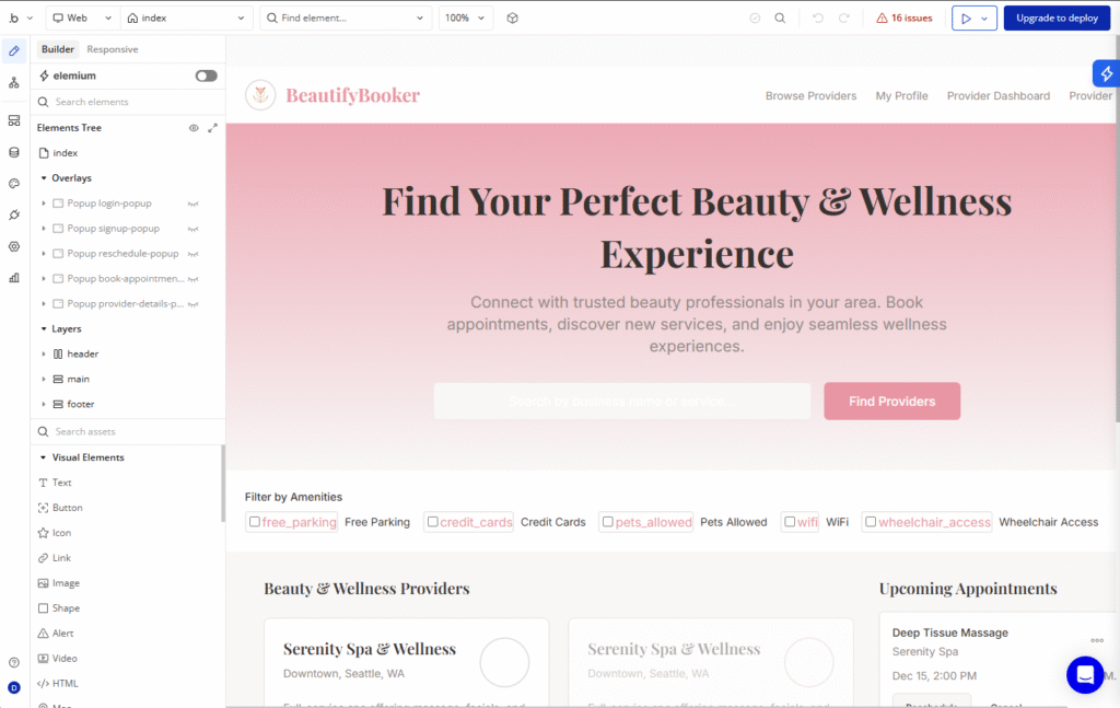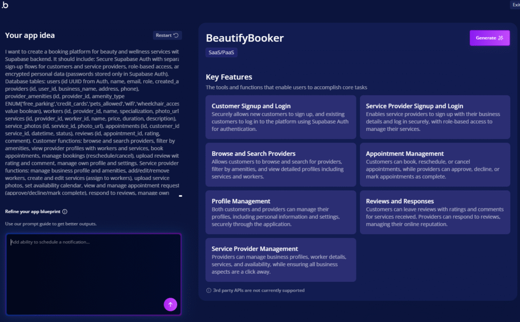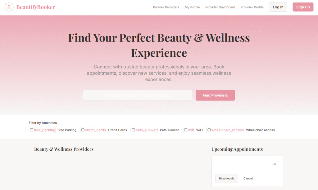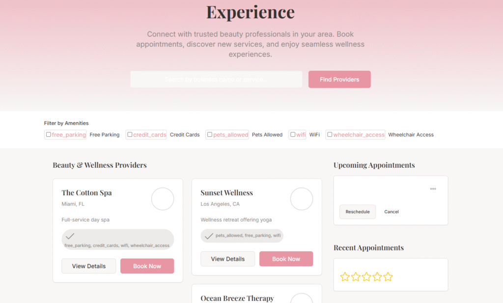 I want to create a booking platform for beauty and wellness services with Supabase backend. It should include: