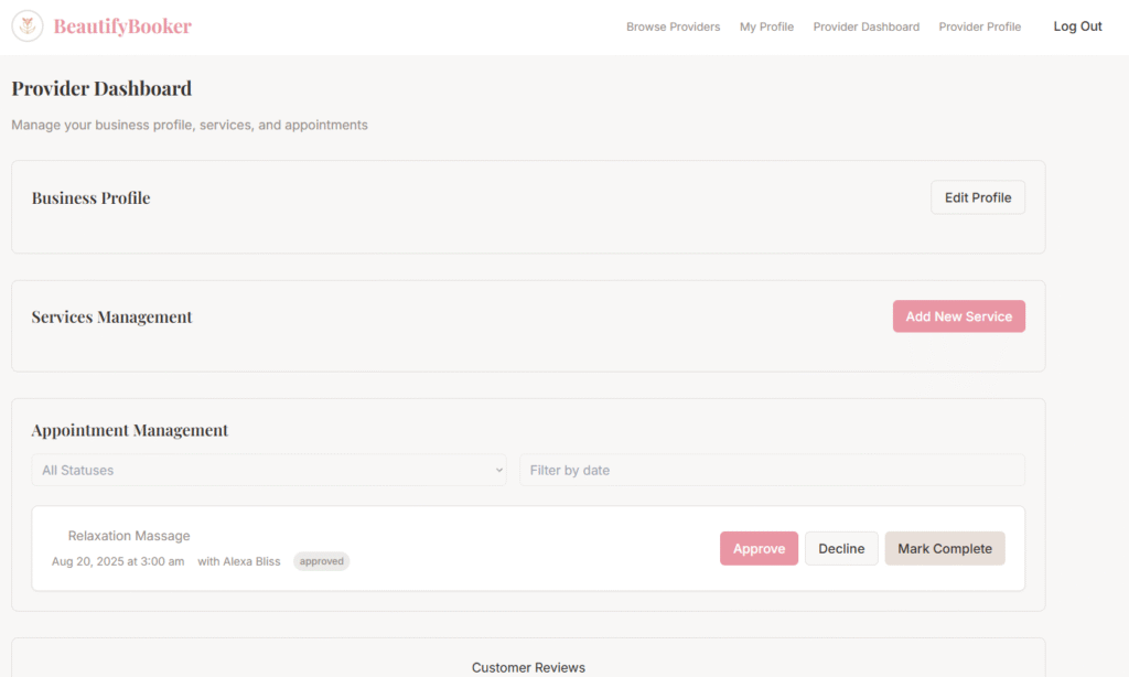 Customer functions: browse and search providers, filter by amenities, view provider profiles with workers and services, book appointments, manage bookings (reschedule/cancel), upload review with rating and comment, manage own profile and settings.