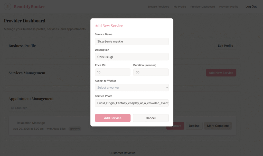 Database tables: users (id UUID from Auth, name, email, role, created_at), providers (id, user_id, business_name, address, phone), provider_amenities (id, provider_id, amenity_type ENUM['free_parking','credit_cards','pets_allowed','wifi','wheelchair_access'], value boolean), workers (id, provider_id, name, specialization, photo_url), services (id, provider_id, worker_id, name, price, duration, description), service_photos (id, service_id, photo_url), appointments (id, customer_id, service_id, datetime, status), reviews (id, appointment_id, rating, comment).